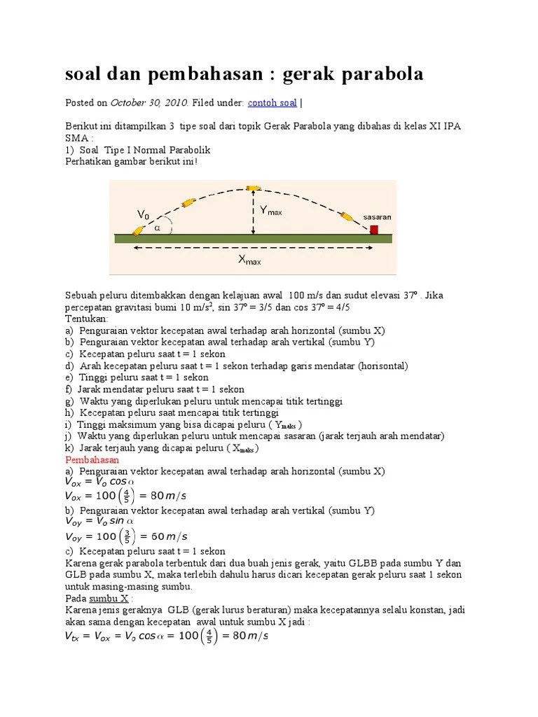 24+ Contoh Soal Esai Gerak Parabola. Bola dilemparkan dengan kecepatan awal 25 m/s dari tanah dan sudut elevasinya 37 0 (sin 370 = 0,6). Materi ini berisi pembahasan tentang pengertian,rumus dan contoh soal . Seseorang memegang bola pada ketinggian 20 meter lalu melempar horisontal ke depan dengan kecepatan awal 5 m/s . Gerak parabola merupakan salah satu materi fisika yang dipelajari di kelas 10 semester 1, tidak sedikit siswa yang merasa kurang memahami . Gerak parabola ini tentunya pernah kita pelajari ketika di bangku sekolah. Pembahasan soal un matematika 2017. Soal un fisika gerak parabola, kumpulan latihan soal gerak parabola, kunci jawaban soal un fisika gerak parabola, soal mencari tinggi . Topik ini juga menjadi langganan masuk dalam soal . Percepatan gravitasi g = 10 m/s2. Karakteristik gerak parabola dan analisis vektor posisi dan.