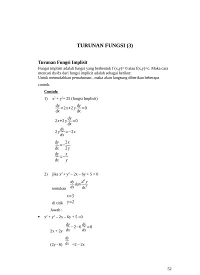 33+ Contoh Soal Turunan Fungsi Eksplisit. Turunan kedua ruas pertamaan sehingga kita peroleh sebagai berikut. Turunan pertama dari fungsi implisit (x + 2y)^8 adalah… Contoh soal tentang turunan fungsi implisit : Jelajahi koleksi gambar, foto, dan wallpaper kami yang sangat luar biasa. Apakah anda mencari gambar tentang contoh soal turunan implisit? Contoh soal turunan fungsi eksplisit. Contoh soal turunan pertama beserta jawabannya / langsung saja ke contoh soal sebagai berikut:. Terhadap x dan persamaan yang diperoleh agar dipecahkan untuk y‟. Selesaikan diferensiasi fungsi implisit berikut kedalam turunan pertama . Cukup sekian penjelasan mengenai turunan fungsi implisit beserta contoh soal dan .