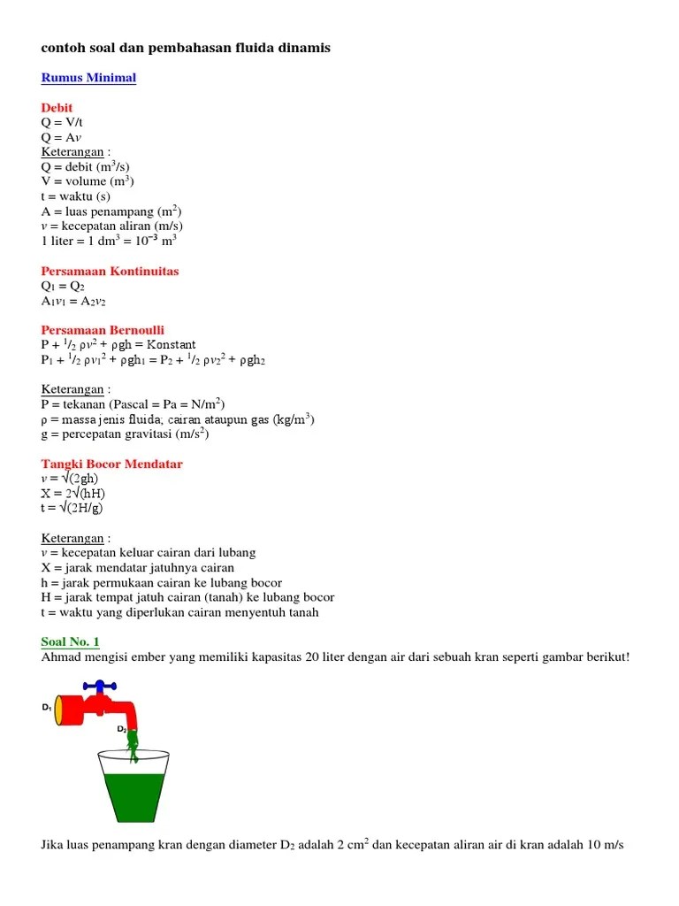 28+ Contoh Soal Jenis Aliran Fluida. Jika kecepatan dalam pipa 50 mm besarnya 12 m/det, berapakah kecepatan dalam pipa 100 mm ? Aliran lurus atau laminer, yaitu aliran fluida mulus. Contoh soal fluida dinamis contoh soal 1. Berikut adalah gambar gelombang transversal. Persamaan ini berasal dari keseimbangan energi mekanik (energi kinetik dan energi potensial) dan tekanan. Sebuah pipa 150 mm mengalirkan 0.08 m3/s, pipa itu bercabang menjadi dua pipa yang satu garis tengahnya 50 mm dan yang lain garis tengahnya 100 mm. Sebuah balok alumunium tidak berongga yang massanya 1 kg digantung pada kait sebuah neraca pegas. Aliran laminer dijumpai pada air yang dialirkan melalui pipa atau selang. V= f×λ = 0.25×8 = 2 m/s. Karena pada kesempatan kali ini disini akan mengulas tentang pengertian fluida dinamis, jenis aliran fluida dinamis, …