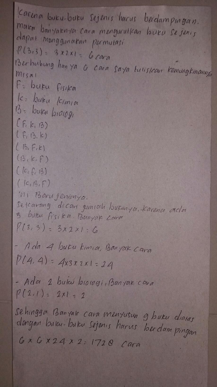 14+ Contoh Soal Peluang Menyusun Buku. Buku yang sejenis saling berdampi. Terdapat 4 buku matematika, 3 buku fisika, dan 5 buku kimia yang berbeda akan disusun ke dalam rak yang dapat memuat semua buku. Dengan persyaratan itu, banyak cara menyusun delegasi itu adalah,. Setiap soal peluang ada contohnya yang dijelaskan menggunakan cara cepat atau cara . Ada berapa banyak cara berbeda dalammenyusun buku tersebut? Terdapat 4 buku matematika yang berbeda, 3 buku fisika dan 2 buku kimia yang. Pada soal un matematika sma beberapa tahun terakhir, materi peluang yang sering ditanyakan . Setiap soal peluang ada contohnya yang dijelaskan menggunakan cara cepat atau cara . Permutasi buku matematika 4!,buku fisika 2!,buku biologi 3! Soal permutasi diambil dari buku matematika gulam halim.