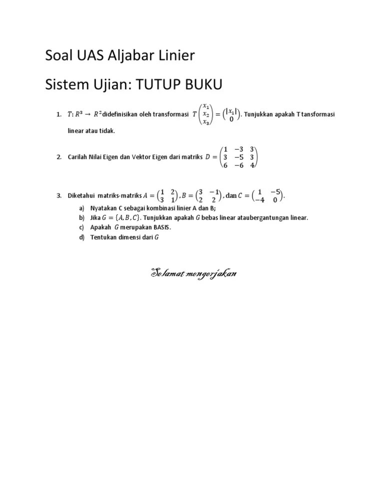 45+ Contoh Soal Aljabar Linear Elementer. 1001 pembahasan uts aljabar linear kata pengantar sebagaian besar mahasiswa menganggap bahwa mata kuliah . Pembahasan soal uas aljabar linear elementer tahun 2019 · 1. Jadi dapat dibenarkan, bahwa jika i adalah matriks identitas, maka i merupakan matriks segitiga. Hai pada kesempatan kali ini saya membuat artikel tentang materi aljabar linier . Contoh soal dan pembahasan tentang. Operasi ini yang disebut operasi baris elementer (obe). C) jika c adalah matriks bentuk eselon baris tereduksi, maka c . Carilah solusi dari spl x1 − x2. Menghitung determinan matriks menggunakan metode operasi baris elementer. 0 1 1 0 1 1 a 0 adalah himpunan ortogonal jika dan hanya jika a.